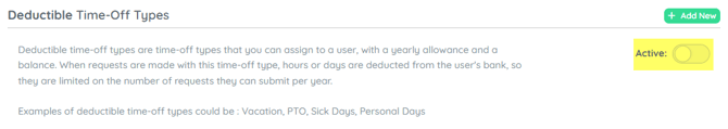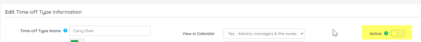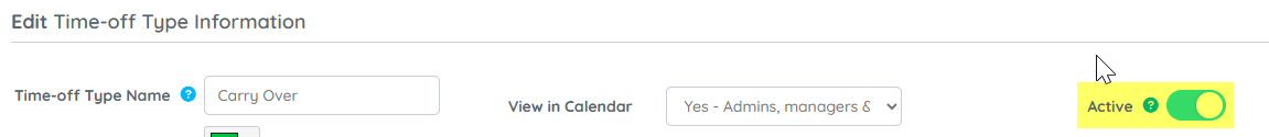 At the top right of the Time Off Types page, use the Active toggle to turn it on or off to switch between: